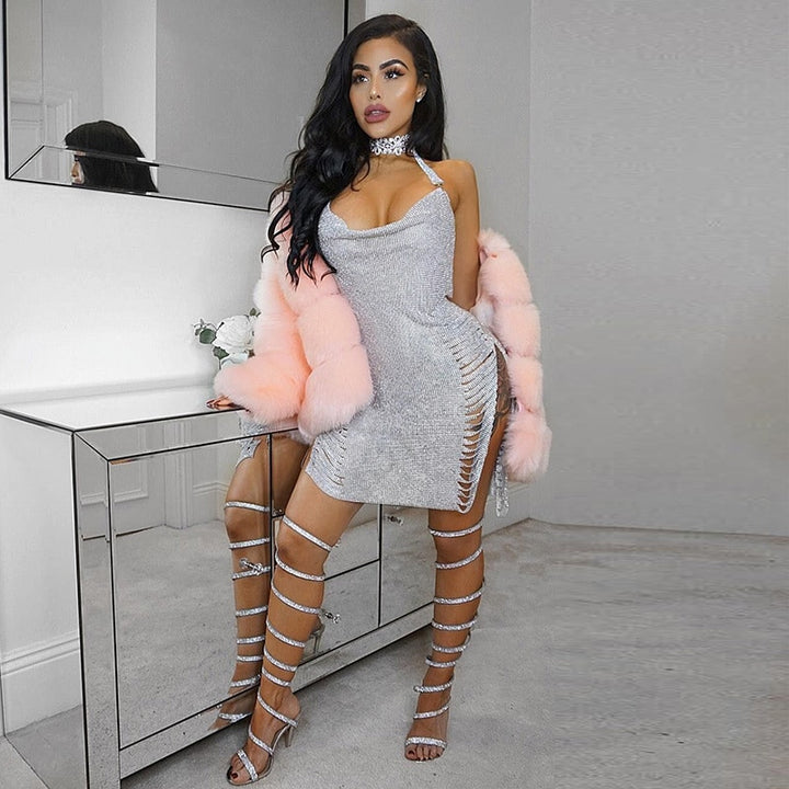 Sexy Rhinestone Tassel Chain Hip High Split Dress