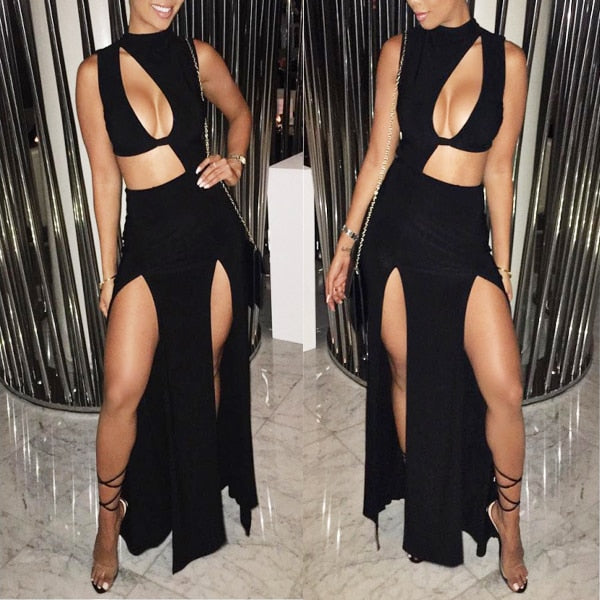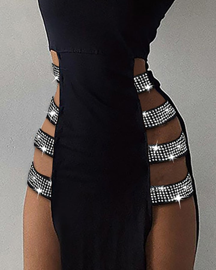 Sexy Sleeveless Mock Neck Studded Bandage Side High Slit Cutout Dresses