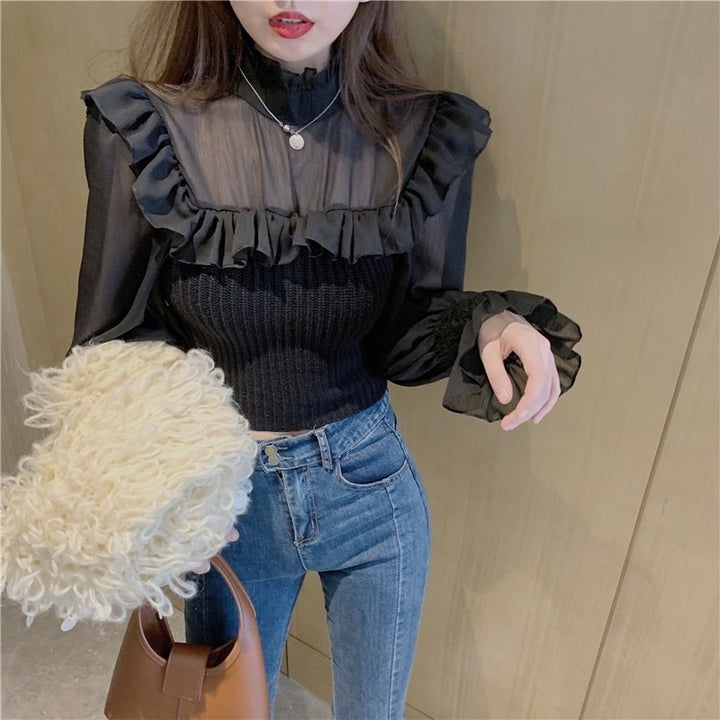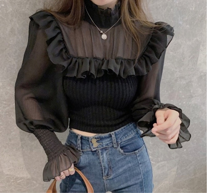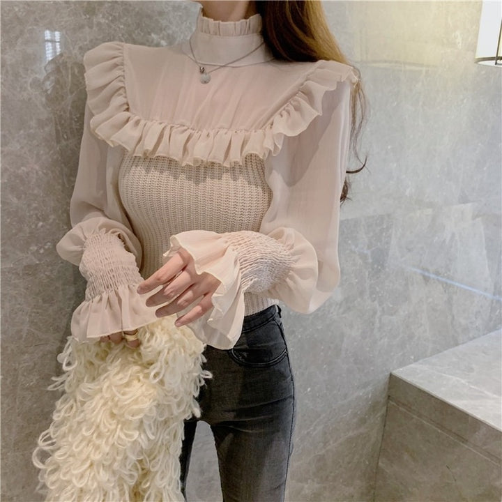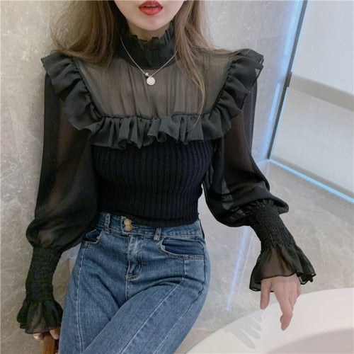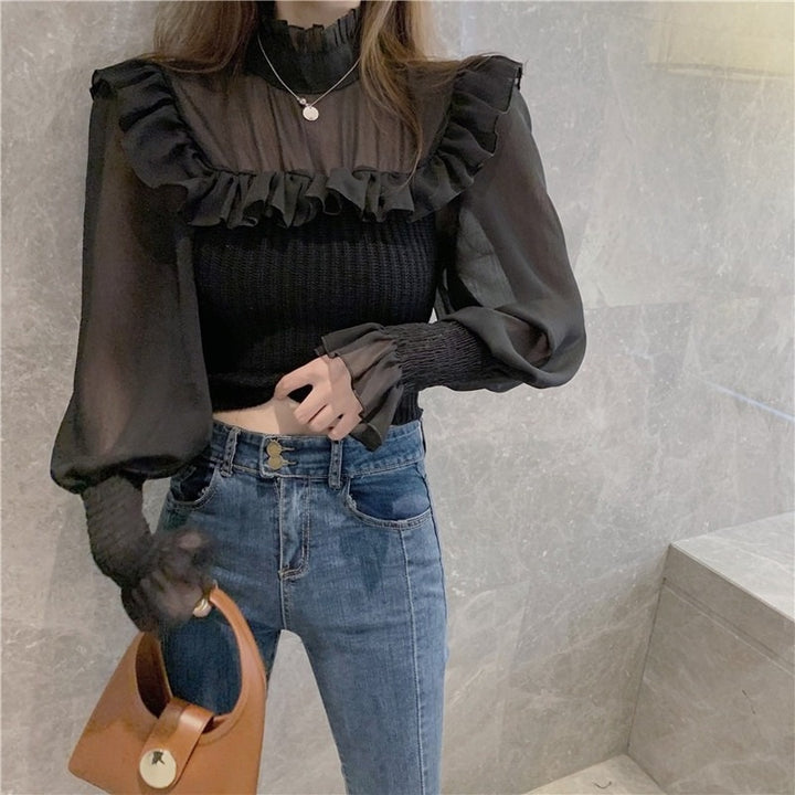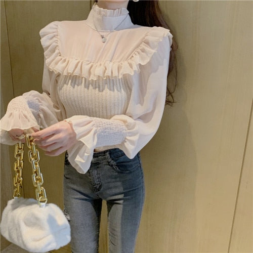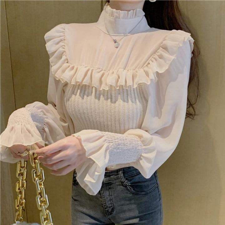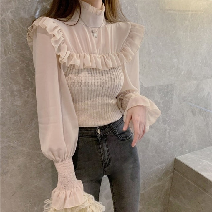 Elegant Knitted Chic Half Turtleneck Lantern Sleeve Tops