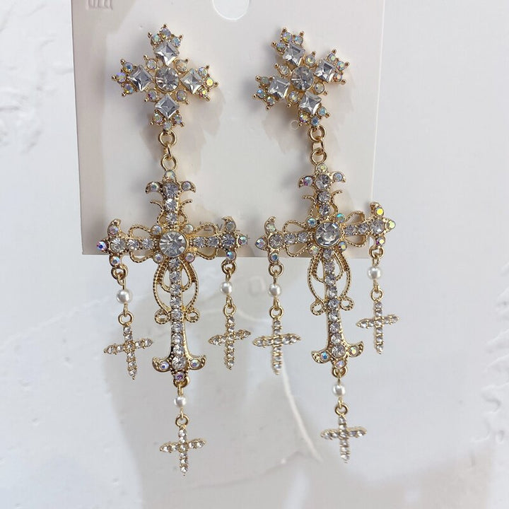 Palace Style Crystal Pearl Cross Dangle Earrings