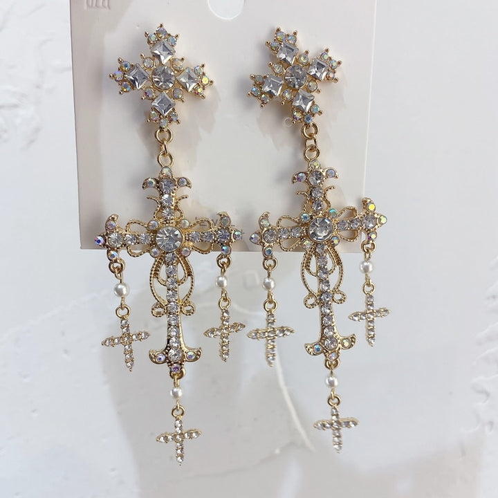 Korean Luxury Palace Crystal Pearl Cross Dangle Earrings