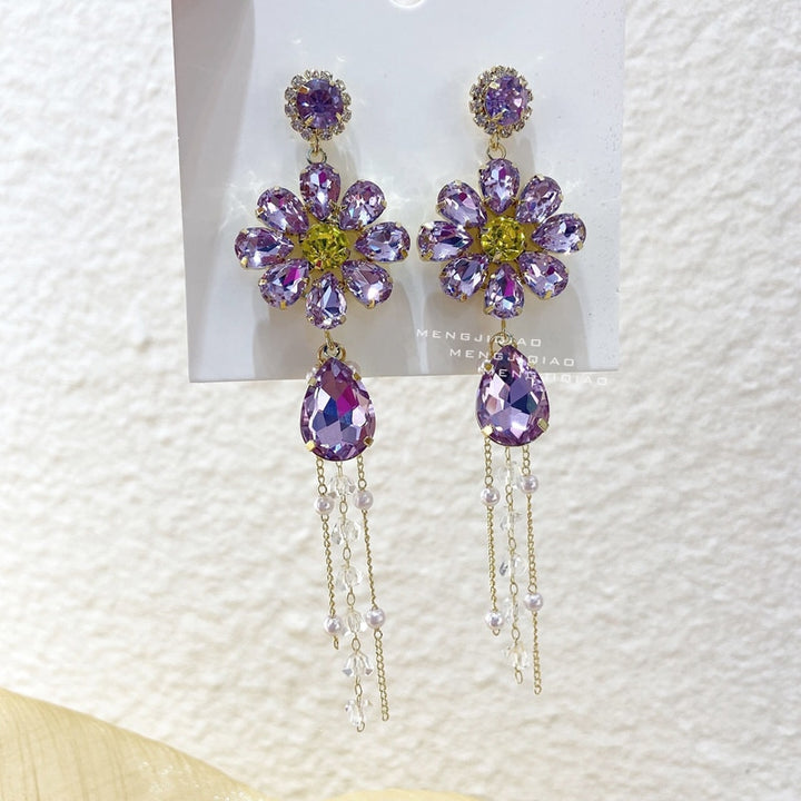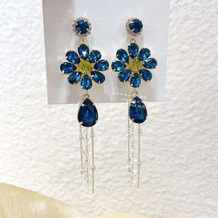 Exaggerated Elegant Flower Crystal Long Pearl Tassel Drop Earrings