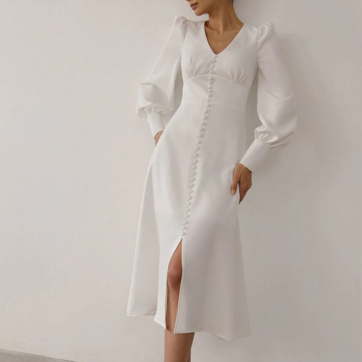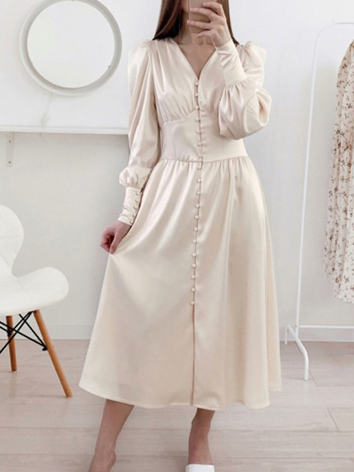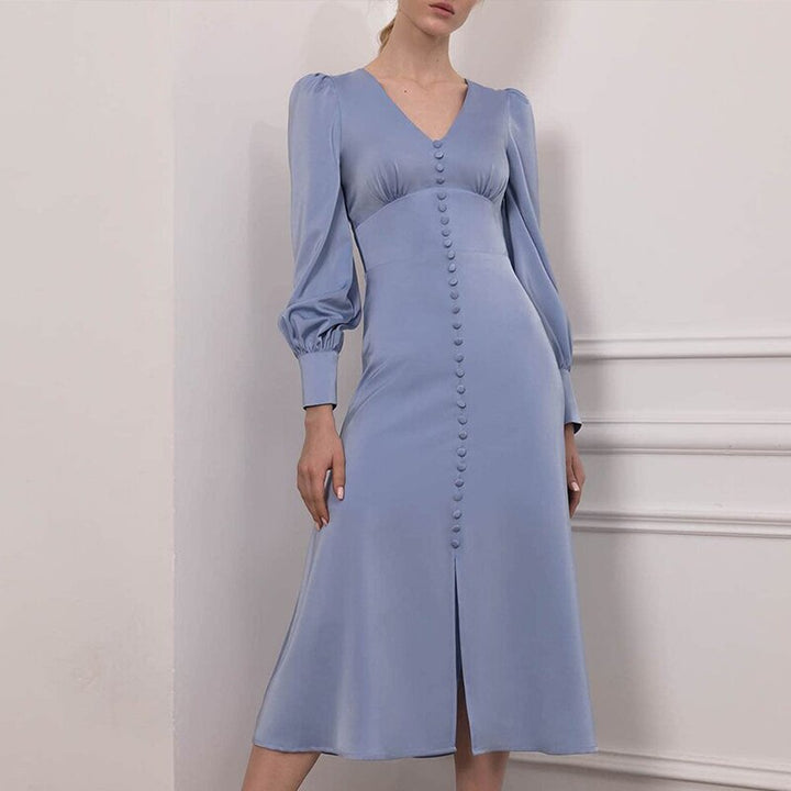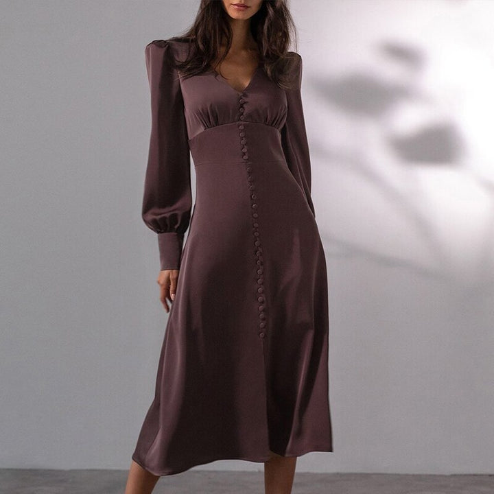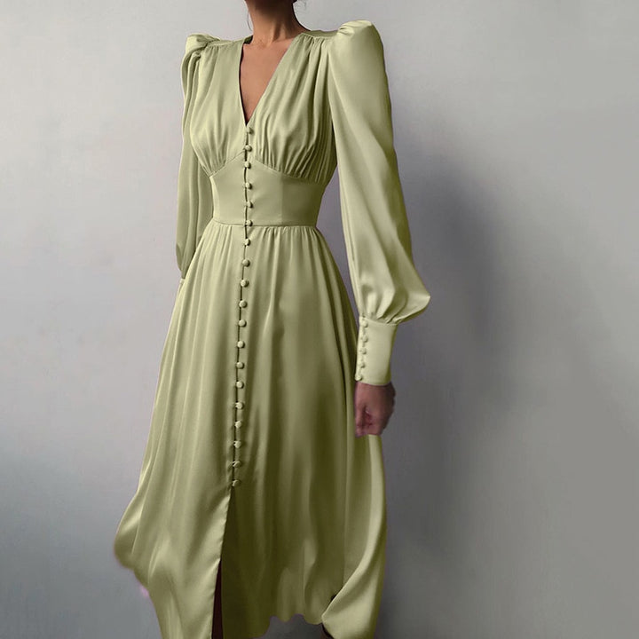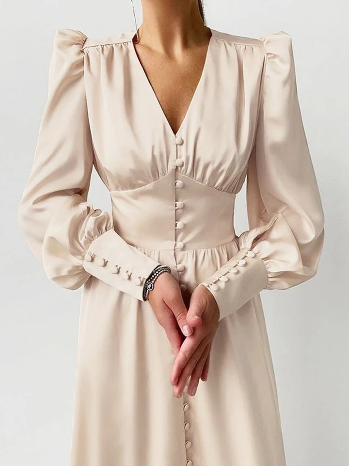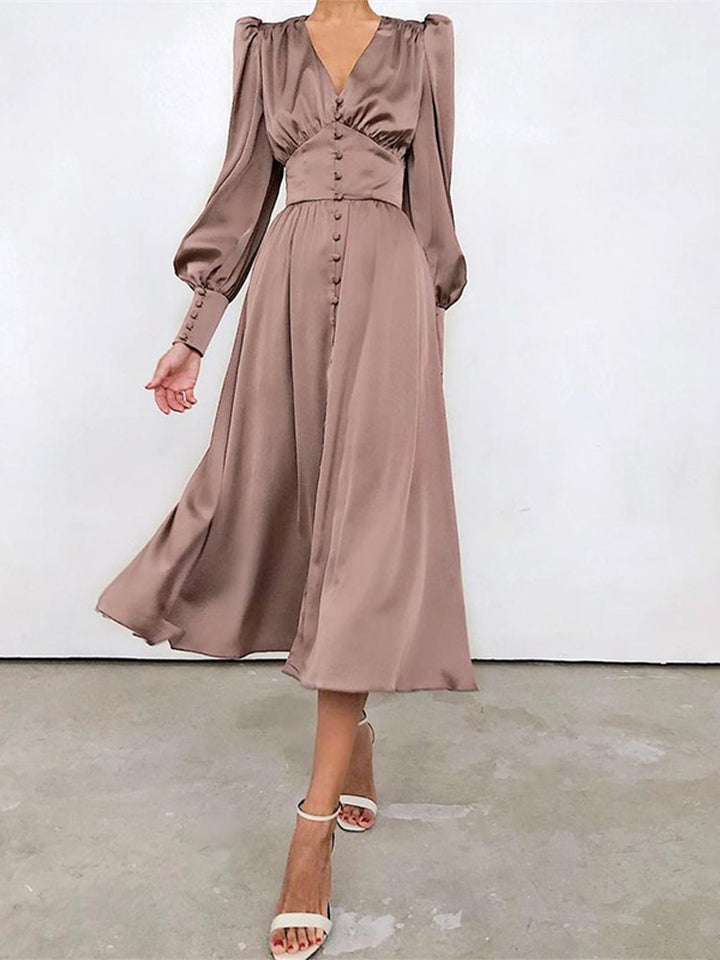 Satin Lantern Sleeve A-Line High Waist Long Dress