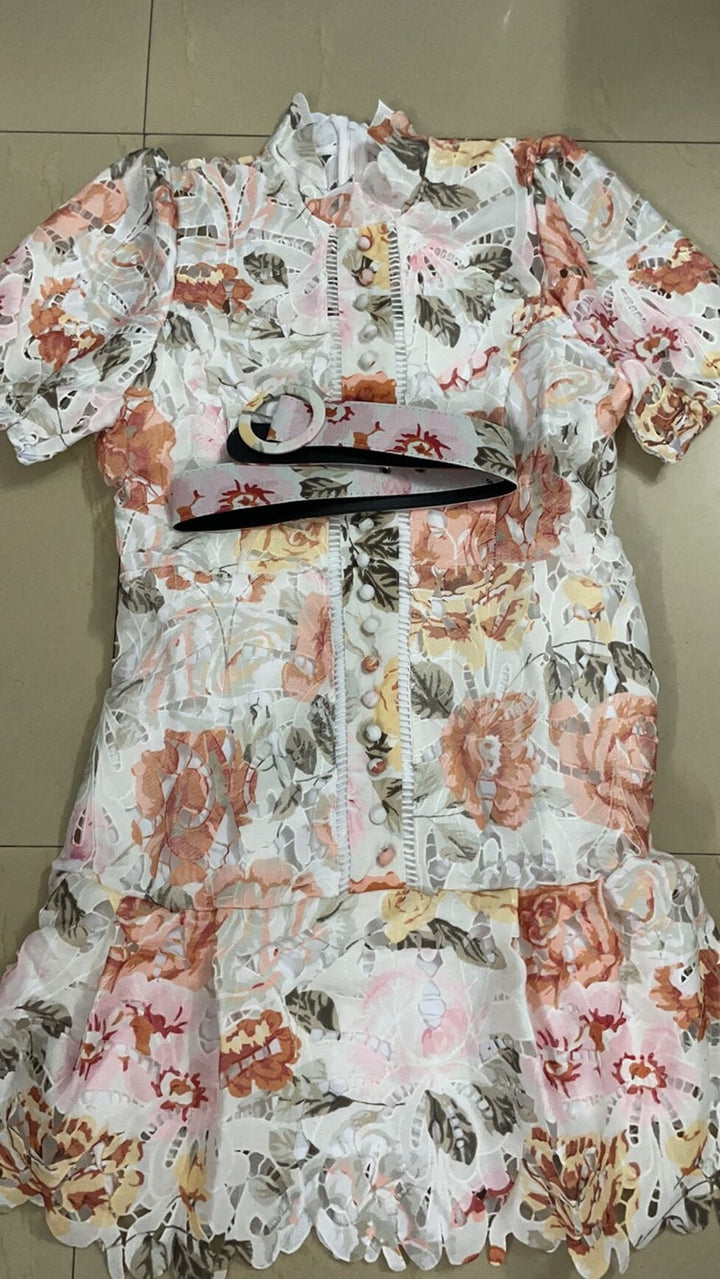 Lace Floral Embroidery Collar Lantern Sleeve High Waist Sash Dresses